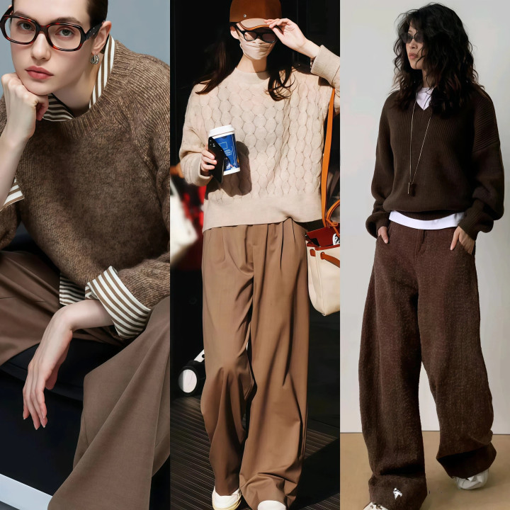 只要穿搭思路对了,一切都不在话下!就好比经典的摩卡棕阔腿裤,穿法就十分百变,可以轻松盘活整个衣橱。配上面料软糯的短毛衣,温柔又复古,搭配挺阔有型的直筒西装,飒爽帅气,配双皮鞋更有范儿!