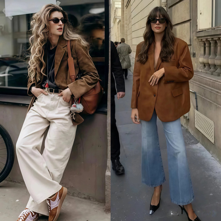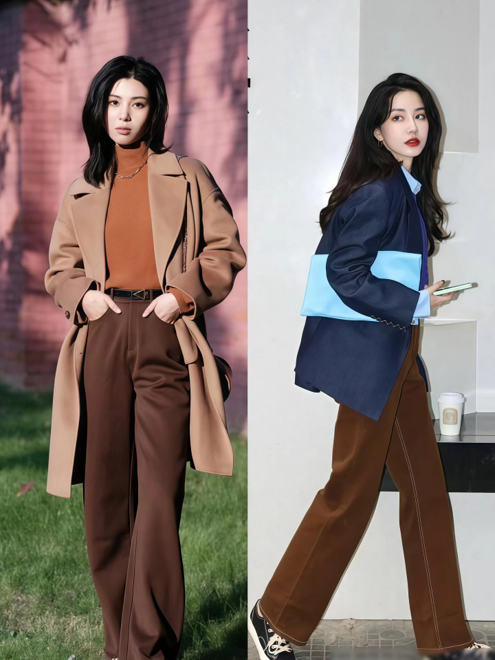 西装早已不是职场人的专属,时尚就是要不断打破“界限”,一件摩卡棕西装,配阔腿裤、喇叭裤都好看。在西装里面,建议可以叠穿一件基础色的低领打底衫,例如黑色衬衫、白色针织衫、灰色毛衣等等。